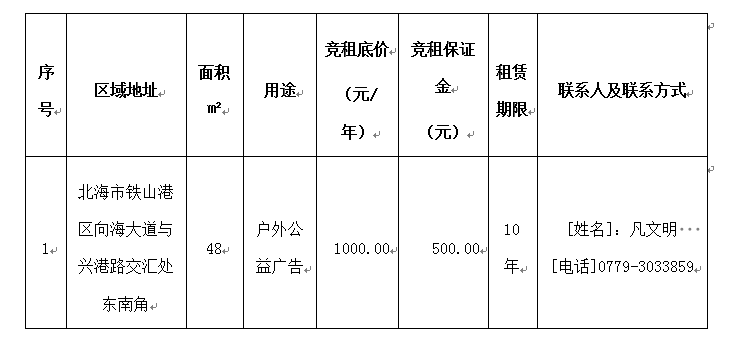 北海市路港建設(shè)投資開發(fā)有限公司(下稱 “出租方”)就以下土地資產(chǎn)進(jìn)行公開招租,現(xiàn)將有關(guān)事項公告如下: